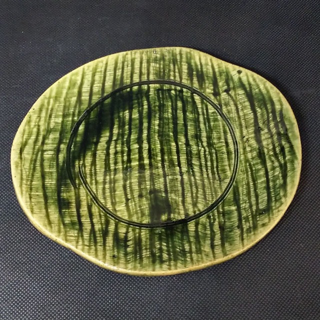 波多野正典作 総織部楕円銘々皿 タテ:約14cm ヨコ:約15.5cm 高さ:約2cm ・写真と実物の色味等が若干異なる場合がございます。予めご了承ください。 ・商品のサイズを記載しておりますが、手造りの為、若干誤差がございますことをご了承ください。 ---土物のご使用上の注意--- ・ご使用前に、熱湯に浸してあらかじめ生地に水分を充分含ませてからご使用頂くと、茶渋・シミ等がつきにくくなります。 ・ご使用後の食器は、汚れを早く落とし台所用洗剤で洗った後、よくすすいで、よく乾燥してご収納下さい。 ・陶器は吸水性があるため、ご使用後の食器を水に浸したままにしておきますと、汚れた水を吸収し、カビ・シミや臭気を発生する原因になります。 ・茶渋・シミ等の汚れが気になる時には、台所用の漂白剤をご使用下さい。
